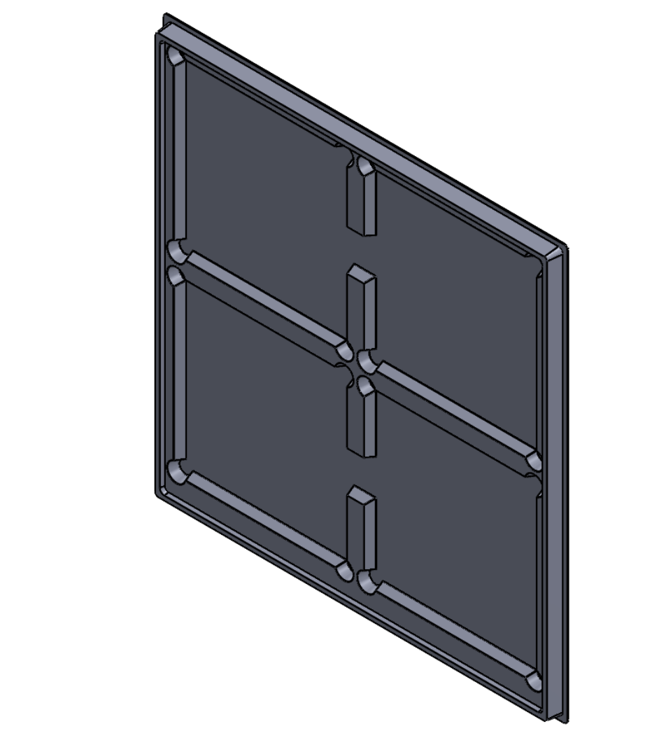 Circuit Board Tray for 4.7″ X 4.7″ circuit board or other electronic component or optic. Height of cavity is .275″. Tray stacks with 180 degree rotation with no load on boards. This 4 cavity tray has corner clearance to prevent damage at the corner locations. Includes finger access for easy removal.